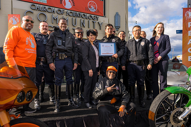 A police officer taking part in this month’s Peace Ride joined the LAPD eight years ago after serving in the Marines. Born and raised in South Central, he knows firsthand the cultural and ethnic tensions that break out in violence in the city. He spoke of the importance of The Way to Happiness as a means to cut through differences and restore communication by reminding people of what we all have in common.