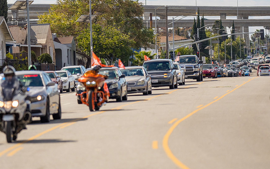 Bikers, low riders and Corvette club members rode through South Los Angeles in celebration of the 10th anniversary of the United in Peace Rides. Along the way, they stopped to pray for the victims of senseless violence. And, as it does each month, the Peace Ride ended at the Church of Scientology Community Center in South Los Angeles, whose participation in each of the rides has been pivotal in the movement’s success.
