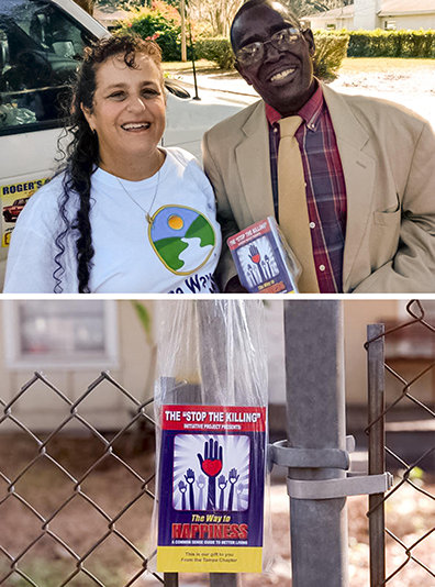 They went door-to-door giving out copies of The Way to Happiness with a custom cover that read, “Stop the Killing.” They spoke to each person about their concerns. Even after a suspect was arrested, they continued into 2018 until all households were reached with the 21 precepts.